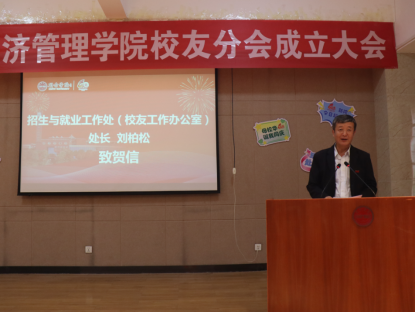 新余学院招生与就业处处长、校友总会秘书长刘柏松代表校友总会致贺信,祝贺校庆40周年与校友分会成立,承诺将持续支持分会工作,希望其充分发挥桥梁作用,凝聚校友力量。